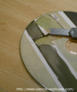 Al no ser agujeros sino surcos la difracción no será perfecta sino que dependerá del ángulo con el que se mire... ¡pero esto es un experimento casero, así que nos conformamos!