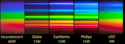 Cada una de esas líneas representa los saltos discretos de los electrones de la cubierta del tubo fluorescente. Compáralos con los espectros de bombillas de distintas marcas que mostré arriba y verás como son idénticos.